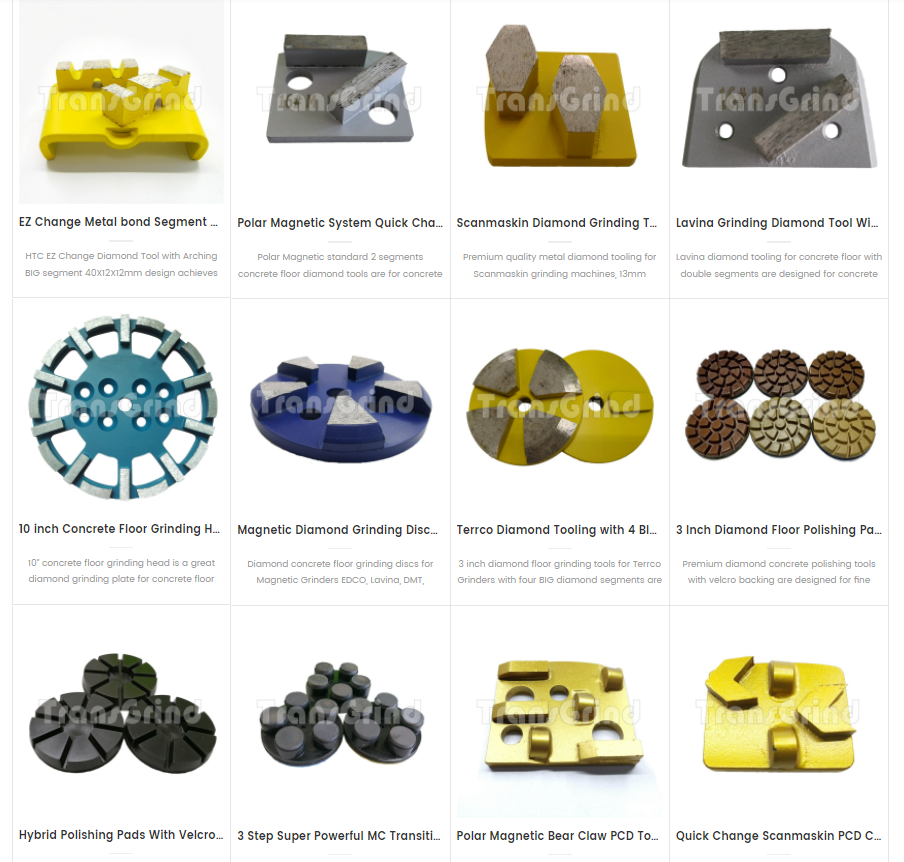 TransGrind supply different kinds of diamond tools for floor grinding and floor polishing. We have supplied many different kinds of diamond tools for many customers, such as Scanmaskin tools, Lavina tools, Klindex tools, Husqvarna tools, HTC tools etc. Welcome to know more about our products by clicking pictures to get into our official web if you are interested.